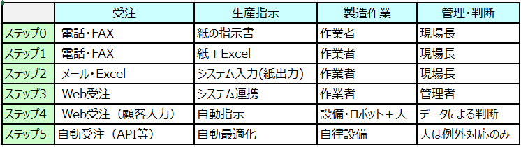典型的な製造業のプロセスを、「受注 → 生産指示 → 製造 → 出荷管理」に単純化して、DXのステップ表にまとめした。