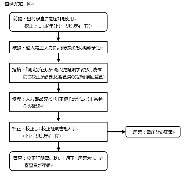 これを見て違和感を持った方も多いと思います。廃棄する前の校正は、それまで正しく測定できていたことを示すために行うものですが、破損して修理したことによりそれまでの測定状態が失われています。審査のための書類を整えるために修理後に校正をしていますが、全く意味のないことです。